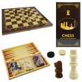 Set din lemn 3 in 1 cu sah, table si dame, durabil si portabil, ideal pentru dezvoltarea logicii si strategiei, oferind jocuri variate intr-un format elegant si usor de transportat.