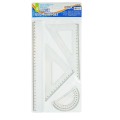 Setul include o rigla/liniar de 30 cm, un echer cu gradatie de 19 cm, un echer dreptunghic cu gradatie de 14 cm si un raportor cu gradatie de 10 cm (180°), acoperind toate nevoile de baza pentru lucrul cu forme si unghiuri. Designul ergonomic si materialul rezistent asigura o utilizare indelungata, fara deformari sau crapaturi. Datorita dimensiunii riglei, acest set este perfect pentru lucrari care necesita masuratori mai ample si trasari precise.