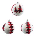Set decorativ cu 3 globuri albe, diametru 8 cm, decorate cu model de bradut rosu. Ofera bradului de Craciun un aspect elegant si modern, perfect pentru sarbatori.